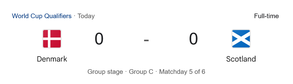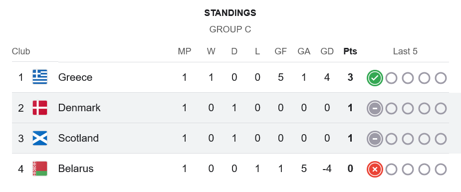 หลังจบเกมแรกของกลุ่ม C กรีซขึ้นนำจ่าฝูงหลังถล่มเบลารุส 5-1 เก็บ 3 แต้ม ส่วนเดนมาร์กและสกอตแลนด์แบ่งแต้มกันไปทีมละ 1 คะแนน อยู่ที่ 2 และ 3 ตามลำดับ ขณะที่เบลารุสยังไม่มีแต้ม ทั้งนี้ผลเสมอนี้ทำให้ทั้งสองทีมต้องเร่งฟอร์มในเกมต่อไปหากหวังเบียดแย่งตั๋วรอบสุดท้าย บ้านผลบอล วิเคราะห์ว่าเกมในกลุ่มนี้จะเข้มข้นทุกนัดแน่นอน