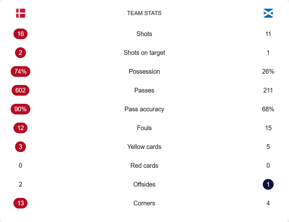 เดนมาร์กครองบอลถึง 74% เทียบกับสกอตแลนด์เพียง 26% จ่ายบอล 602 ต่อ 211 ครั้ง ความแม่นยำ 90% ต่อ 68% แสดงถึงการครองเกมที่เหนือกว่าแบบชัดเจนของเจ้าบ้าน ขณะที่โอกาสยิง เดนมาร์ก 16 ครั้ง เข้ากรอบ 2 ส่วนสกอตแลนด์มีโอกาส 11 ครั้ง เข้ากรอบ 1 ทั้งสองทีมเล่นหนักพอสมควร ฟาวล์รวมกันถึง 27 ครั้ง และมีใบเหลืองถึง 8 ใบ (เดนมาร์ก 3 สกอตแลนด์ 5) ลูกเตะมุม เดนมาร์กมากถึง 13 ครั้ง ส่วนทีมเยือนมี 4 ครั้ง
