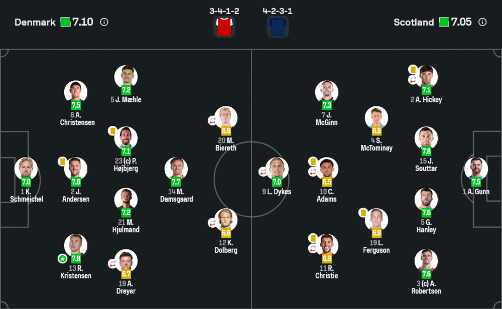 ราสมุส คริสเตนเซน แบ็กขวาของเดนมาร์ก คว้ารางวัลนักเตะยอดเยี่ยมประจำเกม ด้วยผลงานโดดเด่นทั้งเกมรุกและเกมรับ เติมเกมอย่างต่อเนื่อง มีโอกาสสร้างความหวือหวาหลายครั้ง และยังรับมือแนวรุกสกอตแลนด์ได้อย่างอยู่หมัด เรตติ้งสูงสุดในสนาม 7.8