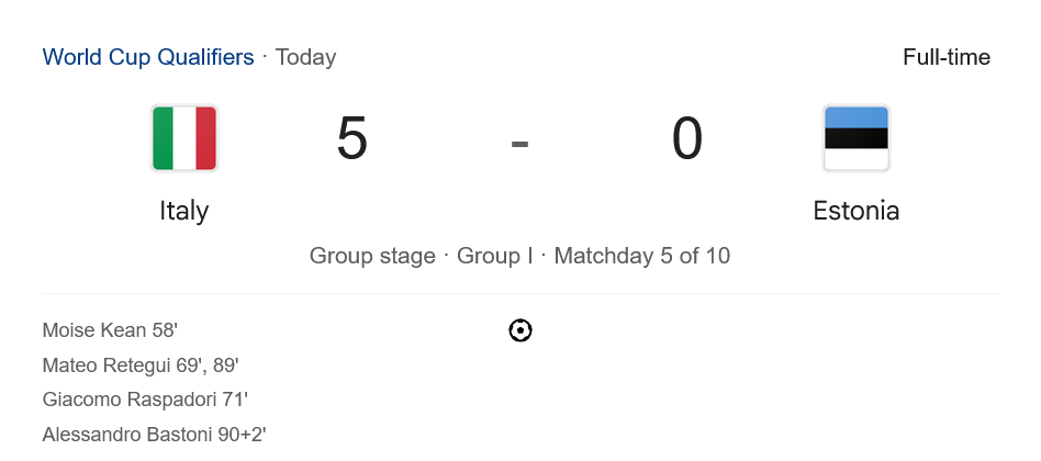 ครึ่งแรก อิตาลีเป็นฝ่ายกดดันตั้งแต่ต้น นาทีที่ 58 โมอิเคน ยิงเบิกร่องให้เจ้าบ้านนำก่อน 1-0 ก่อนที่เกมรุกจะเดินเครื่องไม่หยุด นาทีที่ 69 มาเตโอ เรเตกี ซัดประตูสุดเฉียบขาด ขยับสกอร์ 2-0 ต่อด้วยจาโคโม ราสปาโดรี กดเพิ่มในนาที 71 เป็น 3-0 และยังไม่พอ เรเตกีบวกประตูที่สองของตัวเองในนาที 89 ปิดท้ายด้วยลูกโหม่งของอเลสซานโดร บาสโตนี ช่วงทดเจ็บนาที 90+2 จบเกม บ้านผลบอล ชัดเจน อิตาลีเก็บสามแต้มสำคัญถล่มเอสโตเนียแบบขาดลอย