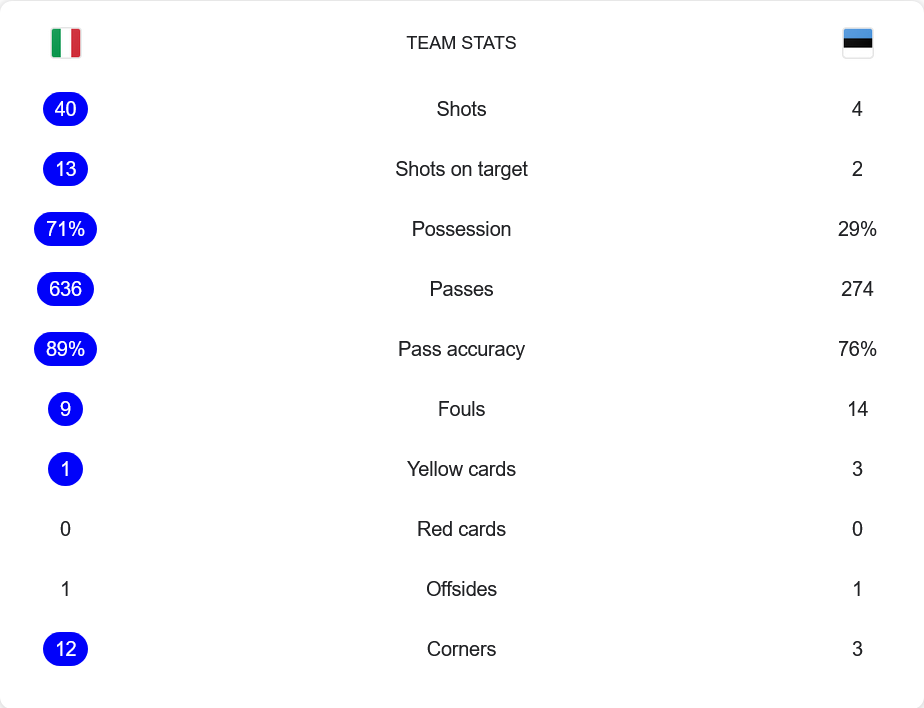 อิตาลีเหนือกว่าอย่างชัดเจนด้วยการครองบอลกว่า 71% สร้างโอกาสยิงถึง 40 ครั้ง เข้ากรอบ 13 ครั้ง ขณะที่เอสโตเนียมีเพียง 4 ครั้งและตรงกรอบ 2 ครั้ง ความแม่นยำในการจ่ายบอลของอิตาลีสูงถึง 89% ส่วนเอสโตเนียอยู่ที่ 76% แสดงให้เห็นถึงความแตกต่างด้านคุณภาพอย่างชัดเจน แม้จำนวนฟาวล์ใกล้เคียงกันแต่เกมรุกของเจ้าบ้านทำให้คู่แข่งต้องเหนื่อยตลอด 90 นาที