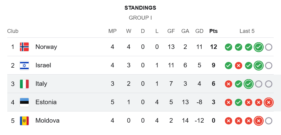 ชัยชนะ 5-0 ช่วยให้อิตาลีเก็บเพิ่มเป็น 6 คะแนนจาก 3 นัด รั้งอันดับ 3 ของกลุ่ม I ไล่ตามอิสราเอลที่มี 9 แต้ม และนอร์เวย์จ่าฝูงที่เก็บ 12 แต้มเต็ม ส่วนเอสโตเนียยังมีเพียง 3 คะแนนจาก 5 นัด อยู่รองบ๊วย โอกาสลุ้นเข้ารอบยากขึ้นเรื่อยๆ