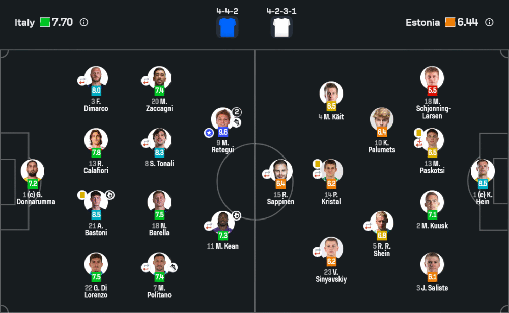 มาเตโอ เรเตกี กองหน้าตัวเป้าของอิตาลีคือพระเอกในค่ำคืนนี้ ยิงไป 2 ประตูเต็มๆ และยังสร้างโอกาสอันตรายหลายครั้ง ได้คะแนนสูงสุด 9.6 จากผลงานที่เฉียบขาดทั้งการจบสกอร์และการเคลื่อนที่ตลอดทั้งเกม
