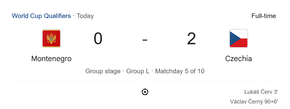 ชัยชนะเกมนี้ส่งผลให้เช็กเก็บเพิ่มเป็น 12 คะแนนจาก 5 นัด ขึ้นนำเป็นจ่าฝูงของกลุ่ม L แบบเหนียวแน่น ส่วนมอนเตเนโกรหยุดอยู่ที่ 6 คะแนน รั้งอันดับ 3 โอกาสลุ้นเข้ารอบยังมี แต่ความพ่ายแพ้ในบ้านนัดนี้ถือว่าเป็นผลกระทบที่ใหญ่ต่อความมั่นใจของทีม