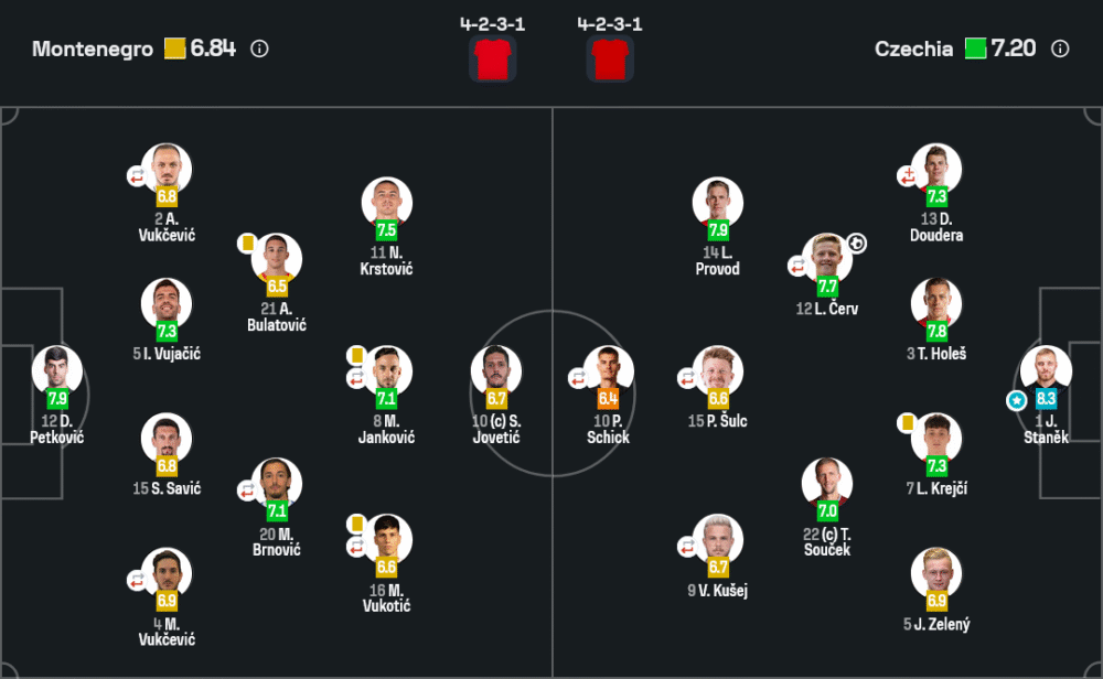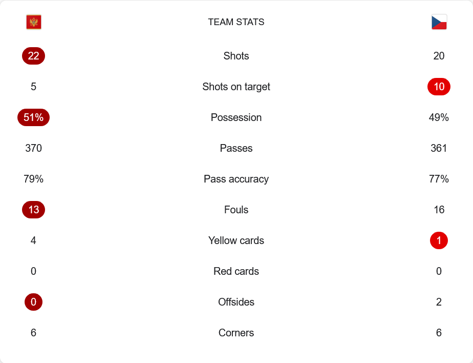 แม้มอนเตเนโกรจะมีโอกาสยิงมากกว่า 22 ครั้ง แต่ตรงกรอบเพียง 5 ครั้ง ขณะที่เช็กยิง 20 ครั้งเข้ากรอบถึง 10 ครั้ง แสดงให้เห็นถึงความคมและการเลือกจังหวะที่ดีกว่า การครองบอลใกล้เคียงกัน มอนเตเนโกร 51% ส่วนเช็ก 49% การจ่ายบอลก็ใกล้กัน 370 ต่อ 361 ครั้ง แต่ความแม่นยำของเช็กสูงถึง 77% ขณะที่เจ้าถิ่นแม้จะมี 79% แต่เจอการเพรสซิ่งดุดันทำให้ผิดพลาดในจังหวะสำคัญ เกมนี้ทั้งสองทีมเข้าปะทะหนัก มีใบเหลืองรวม 5 ใบ