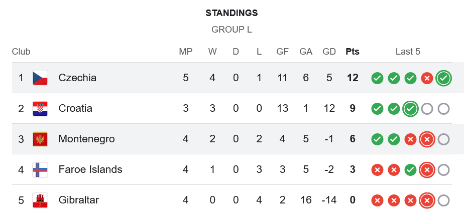 สำหรับโปรแกรมใน ตารางบอล นัดต่อไป เช็กต้องเจอศึกหนักในการบุกไปเยือนโครเอเชีย ส่วนมอนเตเนโกรเตรียมบุกไปเยือนหมู่เกาะแฟโร ซึ่งทั้งสองทีมจำเป็นต้องคว้าผลการแข่งขันที่ดีเพื่อรักษาเส้นทางลุ้นไปฟุตบอลโลก