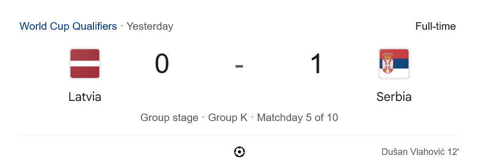 จาก : ผลบอลสด ฟุตบอลโลก 2026 รอบคัดเลือก โซนยุโรป กลุ่ม K ระหว่าง ลัตเวีย 0-1 เซอร์เบีย วันนี้ 6/9/68 – บ้านกีฬา