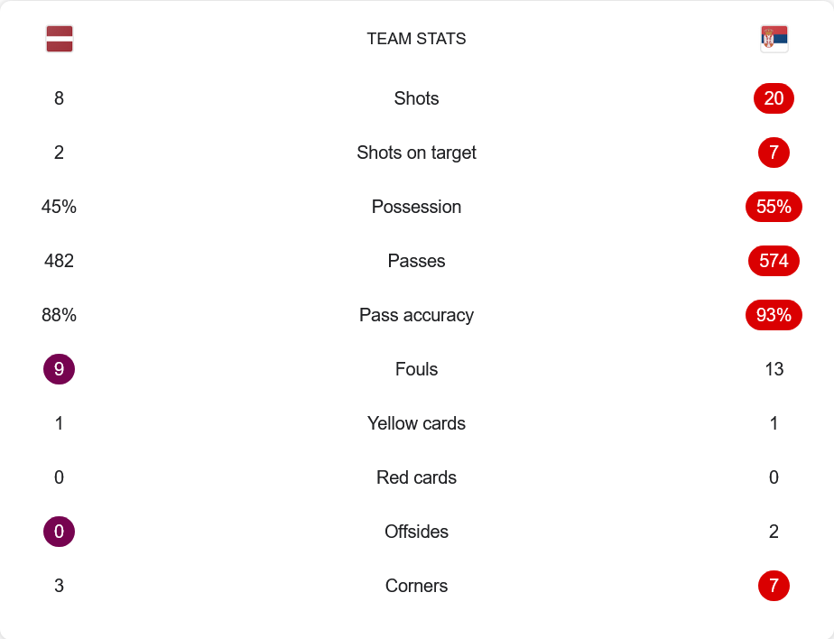 แม้ลัตเวียจะพยายามสู้เต็มที่ แต่รูปเกมบ่งบอกชัดเจนว่าเซอร์เบียเหนือกว่า พวกเขาครองบอล 55% มีโอกาสยิงถึง 20 ครั้ง เข้ากรอบ 7 ครั้ง ขณะที่ลัตเวียครองบอล 45% ยิง 8 ครั้ง เข้ากรอบเพียง 2 ครั้ง ความแม่นยำการจ่ายบอลของเซอร์เบียสูงถึง 93% เทียบกับลัตเวียที่ 88% ตัวเลขเหล่านี้สะท้อนให้เห็นถึงความแตกต่างในประสิทธิภาพการเล่น