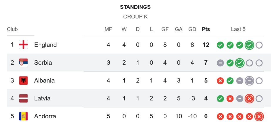 ชัยชนะนัดนี้ทำให้ เซอร์เบีย เก็บเพิ่มเป็น 7 คะแนนจาก 3 นัด รั้งอันดับ 2 ของกลุ่ม K ตามหลัง อังกฤษ ที่นำเป็นจ่าฝูงอยู่ที่ 12 คะแนน ส่วน ลัตเวีย มีเพียง 4 คะแนนจาก 4 นัด รั้งอันดับ 4 ทำให้เส้นทางลุ้นเข้ารอบสุดท้ายยังต้องเหนื่อยหนัก