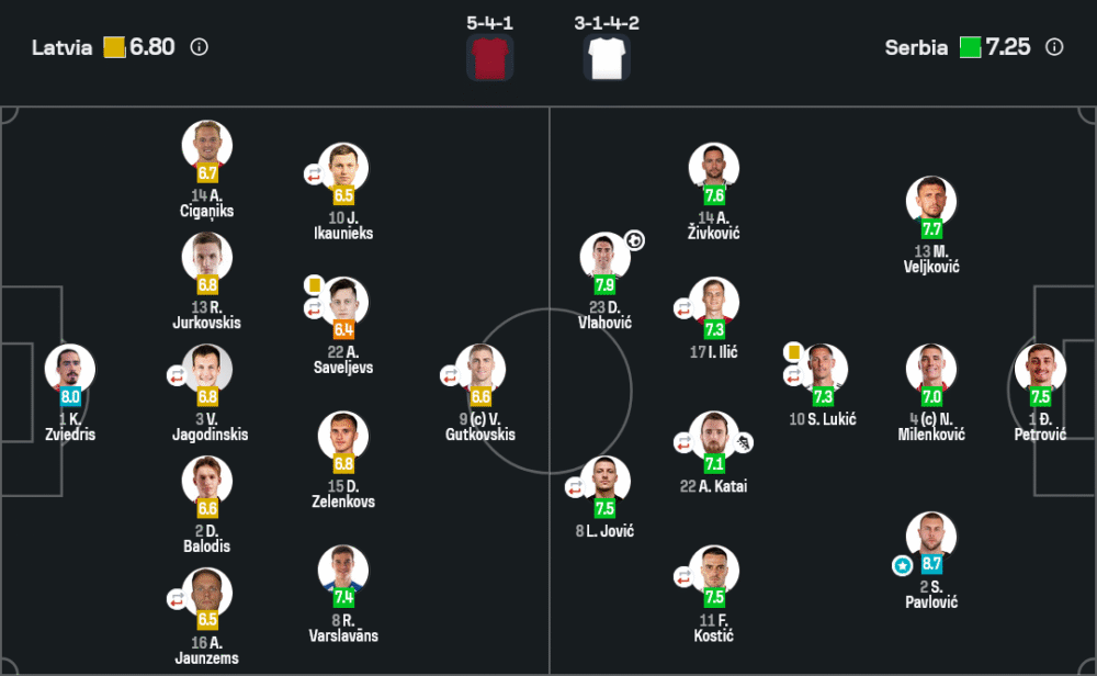 สตราฮินยา พาฟโลวิช ปราการหลังทีมชาติเซอร์เบีย ทำผลงานโดดเด่นสุดในเกมนี้ ได้คะแนนสูงถึง 8.7 สกัดบอลสำคัญหลายครั้ง ปิดทางบุกของลัตเวีย และคุมแนวรับให้เซอร์เบียเก็บคลีนชีตได้สำเร็จ