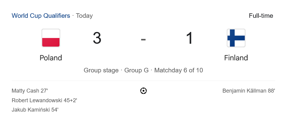 ชัยชนะนัดนี้ทำให้โปแลนด์มี 10 คะแนนจาก 5 นัด ไล่จี้เนเธอร์แลนด์จ่าฝูงที่มี 10 แต้มเท่ากัน แต่ยังแข่งมากกว่า 1 นัด ส่วนฟินแลนด์หยุดอยู่ที่ 7 แต้ม โอกาสลุ้นเข้ารอบต่อไปเริ่มยากขึ้น