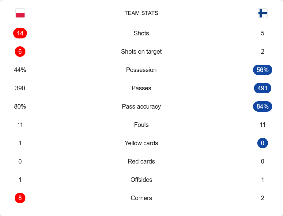 แม้ฟินแลนด์ครองบอลมากกว่า 56% ต่อ 44% แต่โปแลนด์ยิงได้มากกว่าแบบชัดเจน 14 ครั้ง เข้ากรอบ 6 ครั้ง ขณะที่ฟินแลนด์มีโอกาสเพียง 5 ครั้ง เข้ากรอบแค่ 2 ครั้ง การผ่านบอลของฟินแลนด์แม้จะเหนือกว่าเล็กน้อยที่ 491 ครั้ง แต่โปแลนด์เล่นเกมรัดกุมและเปลี่ยนโอกาสเป็นประตูได้ดีกว่า