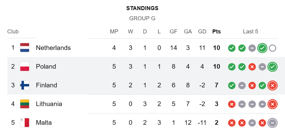 ตาม ตารางบอล โปแลนด์จะบุกเยือนลิธัวเนียในวันที่ 13 ตุลาคมนี้ ส่วนฟินแลนด์จะต้องไปเยือนเนเธอร์แลนด์ ถือเป็นแมตช์สำคัญที่อาจกำหนดชะตาของกลุ่ม G อย่างแท้จริง