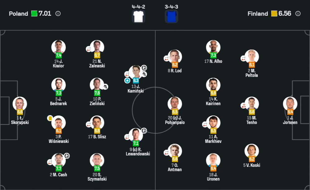 ยาคุบ คามินสกี้ คว้าแมนออฟเดอะแมตช์ไปด้วยคะแนน 8.3 มีส่วนร่วมกับ 2 ประตู ทั้งยิงเองและแอสซิสต์ พลังการเล่นริมเส้นและการเชื่อมเกมรุกทำให้โปแลนด์อันตรายทุกครั้งที่ขึ้นบอล