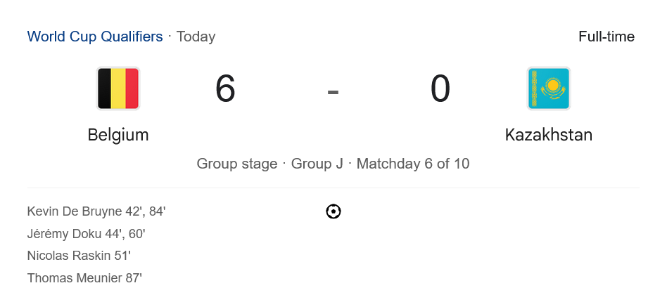 ชัยชนะนัดนี้ทำให้เบลเยียมมี 10 คะแนนจาก 4 นัด ขยับขึ้นอันดับ 2 ของกลุ่ม J ไล่จี้จ่าฝูงนอร์ทมาซิโดเนียที่มี 11 คะแนนเพียงแต้มเดียว ส่วนคาซัคสถานยังจมอยู่อันดับ 4 มีเพียง 3 คะแนน โอกาสเข้ารอบเริ่มเลือนราง