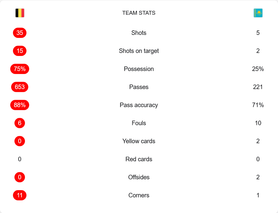 เบลเยียมเหนือกว่าทุกด้านทั้งการครองบอล 75% ต่อ 25% จำนวนการยิง 35 ต่อ 5 ครั้ง การผ่านบอลสำเร็จ 653 ครั้งต่อ 221 ครั้ง ความแม่นยำ 88% ต่อ 71% แม้คาซัคสถานจะพยายามหยุดเกมด้วยการฟาวล์ถึง 10 ครั้ง แต่ก็ไม่สามารถต้านทานความเฉียบคมของแนวรุกเบลเยียมได้เลย
