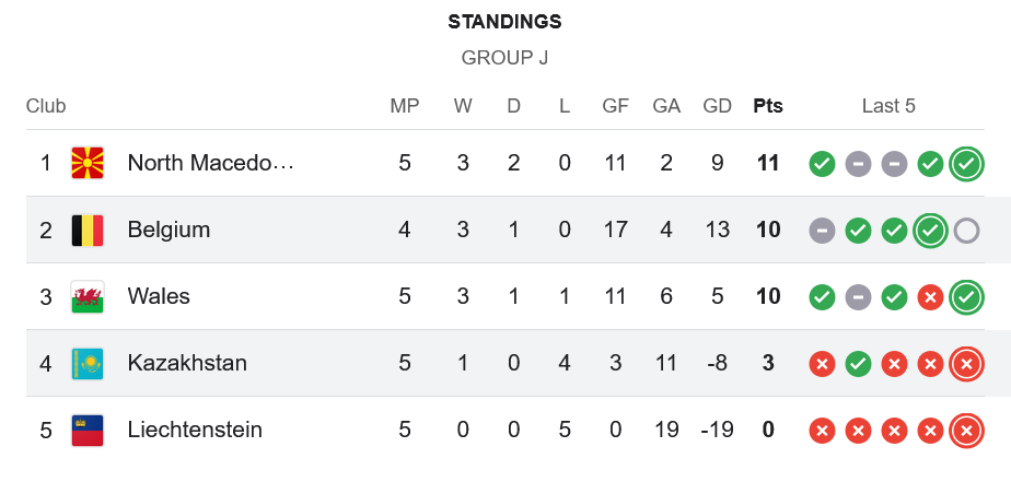 เบลเยียมจะเจอกับเกมหนักในการบุกไปเยือนเวลส์ในวันที่ 14 ตุลาคม ตาม ตารางบอล ที่ประกาศออกมา ซึ่งถือเป็นเกมชี้ชะตาอันดับหัวตาราง ส่วนคาซัคสถานต้องพบงานยากไม่แพ้กันเมื่อบุกไปเยือนนอร์ทมาซิโดเนีย