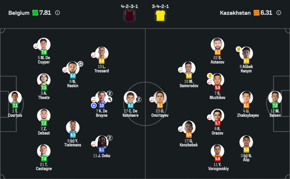 รูปเกมชัดเจนว่าเบลเยียมเล่นด้วยแท็กติกเน้นบุกเต็มพลัง ใช้การต่อบอลสั้นผสมการโยนตัดแนวรับคาซัคสถาน การเคลื่อนที่ของ เดอ บรอยน์ และ โดกู สร้างปัญหาให้คู่แข่งตลอดทั้งเกม ขณะที่แผงหลังแทบไม่ได้เผชิญแรงกดดันมากนัก ฝั่งคาซัคสถานเน้นตั้งรับลึกและหวังสวนกลับ แต่ขาดคุณภาพในการจบสกอร์ ตามสถิติพวกเขามีเพียง 5 ครั้งที่ยิงได้ ขณะที่เบลเยียมกดไปถึง 35 ครั้ง แสดงให้เห็นความแตกต่างชัดเจนของเกมรุกและเกมรับทั้งสองทีม ซึ่งหากมองในเชิง วิเคราะห์บอล เบลเยียมถือว่ากลับมาโชว์ศักยภาพที่แท้จริงในค่ำคืนนี้