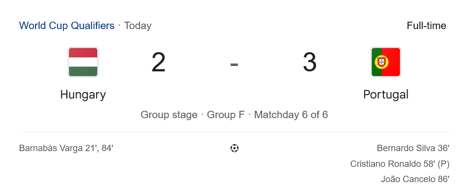 ชัยชนะนัดนี้ส่งโปรตุเกสมี 6 คะแนนเต็มจาก 2 นัด รั้งจ่าฝูงกลุ่ม F อย่างสง่าผ่าเผย ส่วนฮังการีมีเพียง 1 แต้ม รั้งอันดับ 3 สถานการณ์เริ่มกดดัน ต้องเร่งเก็บชัยในเกมถัดไปเพื่อโอกาสลุ้นเข้ารอบ