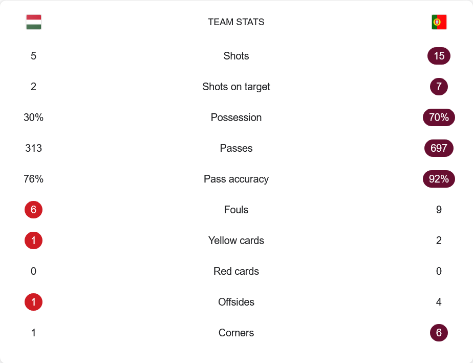 โปรตุเกสเหนือกว่าแทบทุกมิติ ครองบอล 70% ต่อ 30% ผ่านบอลมากถึง 697 ครั้ง ความแม่นยำสูงถึง 92% เทียบกับฮังการีที่ทำได้เพียง 313 ครั้ง ความแม่นยำ 76% โอกาสยิง 15 ต่อ 5 เข้ากรอบ 7 ต่อ 2 โปรตุเกสได้เตะมุม 6 ครั้ง ส่วนฮังการีมีเพียง 1 ฟาวล์ใกล้เคียงกัน ฮังการี 6 โปรตุเกส 9 ใบเหลืองเจ้าถิ่น 1 ทีมเยือน 2