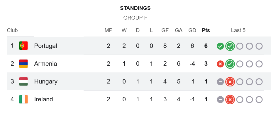 โปรตุเกสยังมีคิวดวลไอร์แลนด์และฮังการีอีกครั้งในเดือนตุลาคม ส่วนฮังการีจะเจออาร์เมเนียก่อนจะไปเยือนฝอยทองอีกหน เกมต่อไปใน ตารางบอล กลุ่มนี้จึงเข้มข้นขึ้นทุกขณะ
