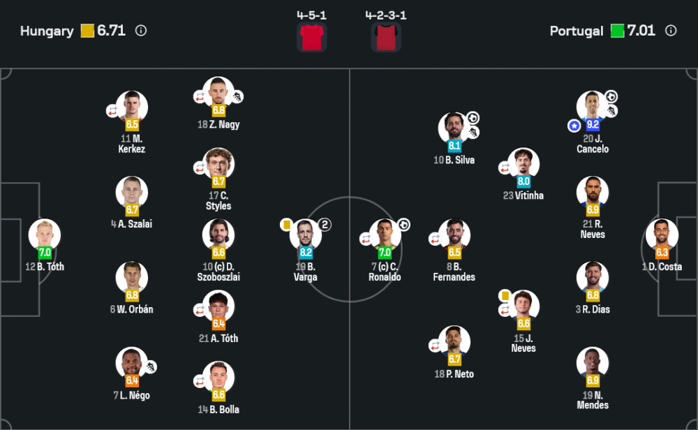 🟨 ใบเหลือง: ฮังการี 1 ใบ (Varga), โปรตุเกส 2 ใบ (Palhinha, J. Neves)