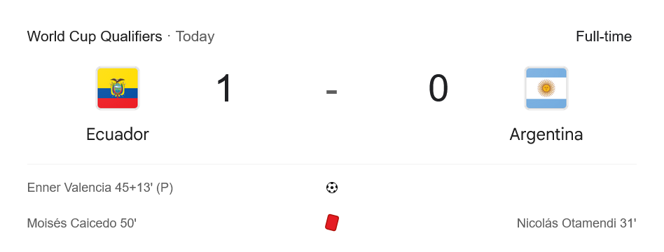 ครึ่งหลังอาร์เจนตินาพยายามแก้เกมส่ง จูเลียน อัลวาเรซ และ โล เซลโซ ลงมาช่วยเกมรุก แต่ยังเจาะไม่เข้า แถมสถานการณ์พลิกอีกครั้งนาที 50 เมื่อ มอยเซส ไคเซโด้ ของเอกวาดอร์ โดนใบแดง ทำให้ทั้งสองทีมเหลือ 10 คนเท่ากัน เกมจึงเปิดแลกหนัก เอกวาดอร์อาศัยการสวนกลับจาก อังเคโล่ และ เกร์ซอน ปลาต้า ได้ลุ้นหลายครั้ง ส่วนอาร์เจนตินายังขาดความคม สุดท้ายเสียงนกหวีดดัง เอกวาดอร์เชือด 1-0 เก็บสามแต้มสำคัญได้ต่อหน้าแฟนบอล