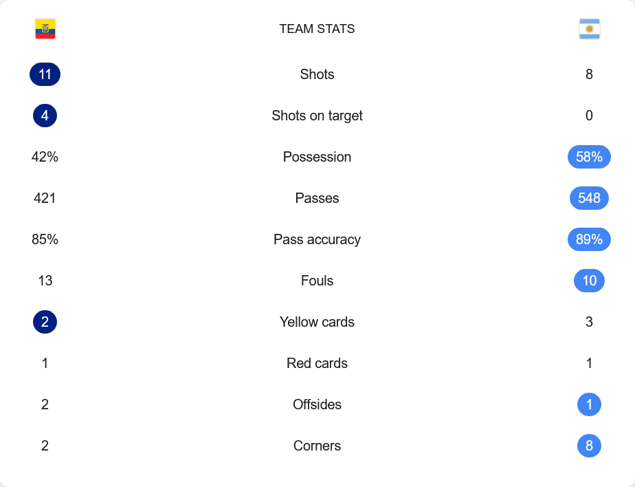 เกมนี้อาร์เจนตินาครองบอลได้ 58% ต่อ 42% ของเจ้าถิ่น จ่ายบอลมากถึง 548 ครั้ง เทียบกับเอกวาดอร์ที่ทำได้ 421 ครั้ง แต่ความแม่นยำของทั้งสองทีมใกล้เคียงกันที่ 89% และ 85% ตามลำดับ เอกวาดอร์ยิงทั้งหมด 11 ครั้ง เข้ากรอบ 4 ส่วนอาร์เจนตินายิง 8 ครั้งแต่ไม่มีบอลตรงกรอบเลย ทำให้รูปเกมเหมือนครองบุกแต่ไร้ประสิทธิภาพ ฟาวล์รวมกันสูงถึง 23 ครั้งและมีใบแดงฝั่งละ 1 ทำให้บรรยากาศเดือดตลอดเกม