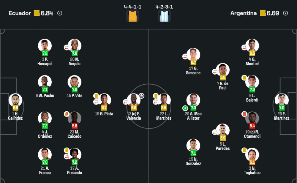 ส่วนอาร์เจนตินามาใน 4-2-3-1 เน้นการครองบอลและขึ้นเกมจากแดนกลางโดย เดอ ปอล และแม็ค อัลลิสเตอร์ แต่การขาด ลิโอเนล เมสซี่ ทำให้ความหลากหลายหายไปเยอะ การรับแม้จะมีโครงสร้างแน่น แต่การโดนใบแดงเร็วจากโอตาเมนดี้ทำให้เกมรับเสียสมดุล การ วิเคราะห์บอล เกมนี้จึงชัดเจนว่า เอกวาดอร์เล่นอย่างมีวินัยและอาศัยจังหวะเฉียบคม ขณะที่ฟ้าขาวพลาดเองและจบสกอร์ไม่เฉียบพอ