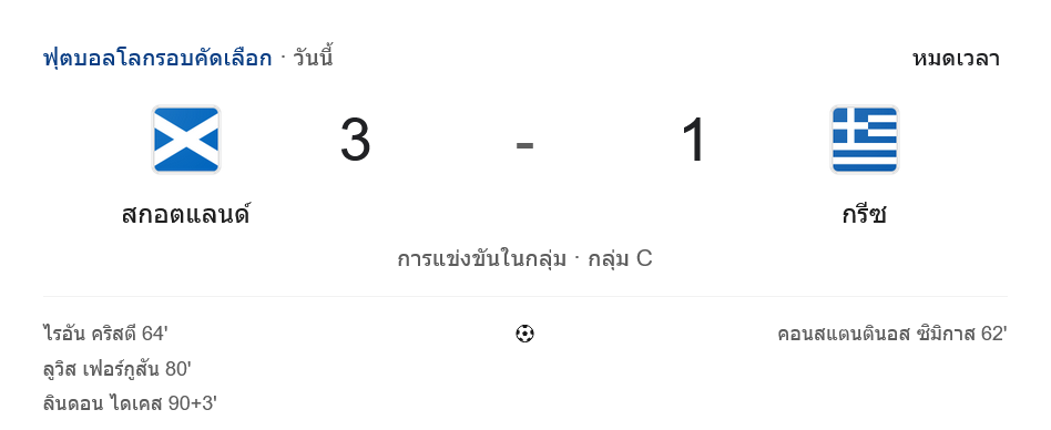 ศึก ฟุตบอลโลก รอบคัดเลือก โซนยุโรป กลุ่ม C คืนนี้เป็นอีกหนึ่งเกมที่แฟนบอลต้องบันทึกไว้ในความทรงจำ หลัง สกอตแลนด์ เปิดบ้านโชว์ฟอร์มดุดัน ถล่มกรีซ 3-1 ส่งเสียงกระหึ่มทั่วสนาม กลาสโกว์ เกมนี้ บ้านกีฬา รายงาน ผลบอลสด แบบเกาะติดทุกจังหวะ และต้องบอกเลยว่าเต็มไปด้วยความเข้มข้นตั้งแต่ต้นจนจบ