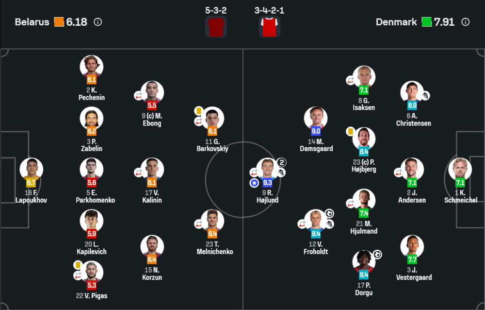 ราสมุส ฮอยลุนด์ กองหน้าฟอร์มแรงของเดนมาร์กระเบิดผลงานระดับโลก ซัดแฮตทริกสุดเฉียบ พร้อมมีส่วนร่วมเกือบทุกจังหวะบุก ได้คะแนนสูงสุดของเกมที่ 9.3 สมบูรณ์แบบทั้งการจบสกอร์และการเคลื่อนที่สร้างพื้นที่ให้เพื่อนร่วมทีม