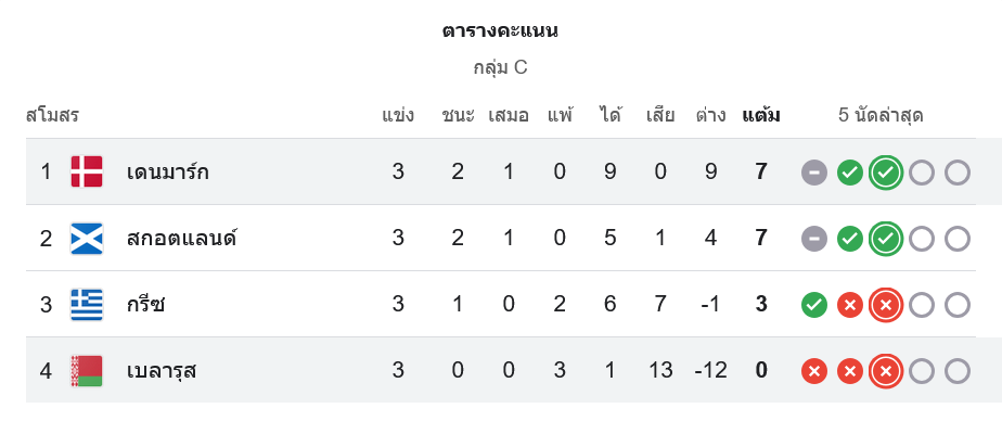 ตาม ตารางบอล เดนมาร์กจะเปิดบ้านพบกรีซในวันที่ 13 ตุลาคม ถือเป็นแมตช์สำคัญที่อาจตัดสินตำแหน่งจ่าฝูงของกลุ่ม ส่วนเบลารุสมีคิวบุกไปเยือนสกอตแลนด์ในวันเดียวกัน โอกาสหนีบ๊วยยังดูหืดจับ