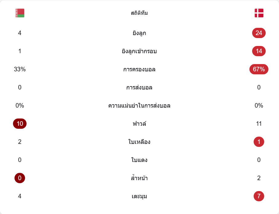 เกมนี้เดนมาร์กเหนือกว่าทุกมิติ พวกเขาครองบอลถึง 67% เทียบกับเบลารุส 33% สร้างโอกาสยิงมากถึง 24 ครั้ง เข้ากรอบ 14 ครั้ง และเปลี่ยนเป็น 6 ประตูเต็ม ขณะที่เจ้าถิ่นมีโอกาสยิงแค่ 4 ครั้ง เข้ากรอบเพียงลูกเดียว ความแม่นยำในการทำประตูและความหลากหลายของเกมรุกคือกุญแจสำคัญ เบลารุสฟาวล์ 10 ครั้ง เดนมาร์ก 11 ครั้ง มีใบเหลืองรวมทั้งหมด 3 ใบ เกมนี้เดนมาร์กได้เตะมุมถึง 7 ครั้ง ขณะที่เจ้าถิ่นได้เพียง 4
