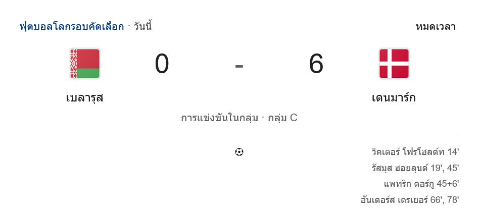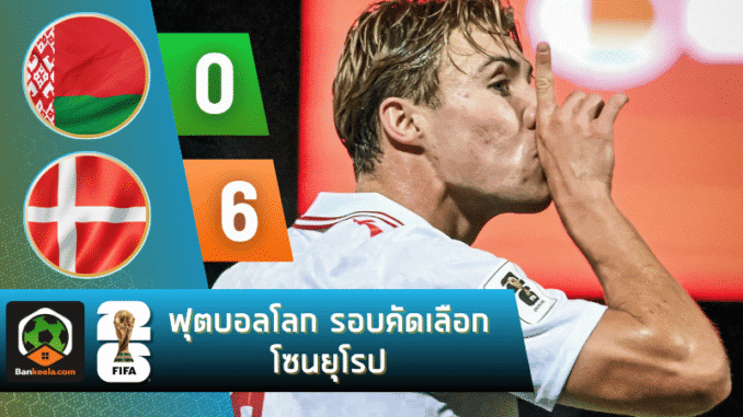 บ้านผลบอล สรุปหลังเกม ฟุตบอลโลก รอบคัดเลือก ยูฟ่า เดนมาร์กบุกถล่มเบลารุส 6-0 “ฮอยลุนด์” โชว์ฟอร์มพระเอก ยิงแฮตทริกสุดเฉียบ!