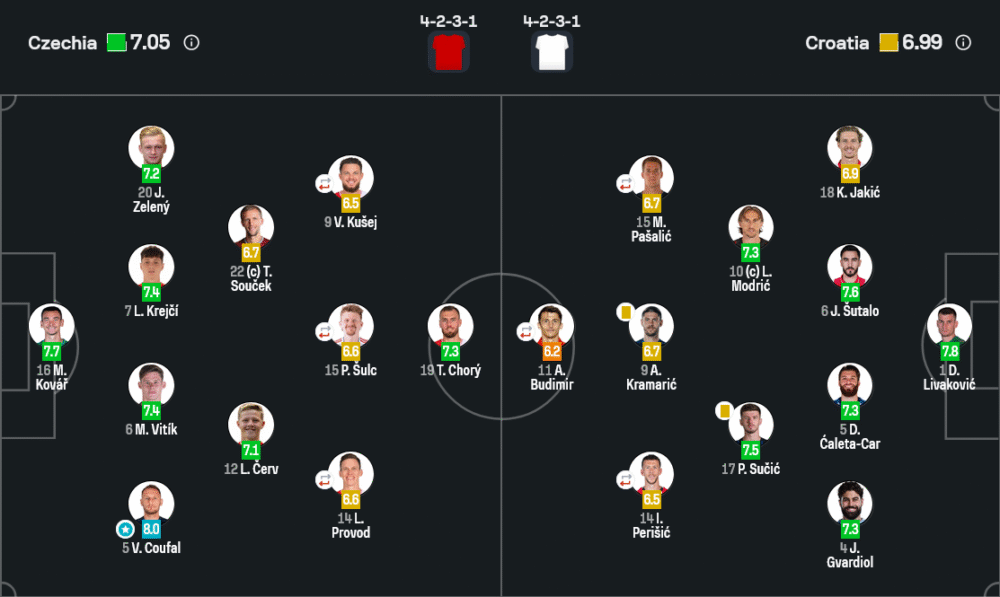 Vladimír Coufal คือฮีโร่ของเกมนี้สำหรับฝั่งเช็ก เล่นได้อย่างยอดเยี่ยมทั้งเกมรับและเกมรุก ได้คะแนนสูงสุด 8.0 ตัดบอลสำคัญหลายจังหวะ และช่วยให้ทีมไม่เสียประตูในเกมที่กดดันสุดๆ