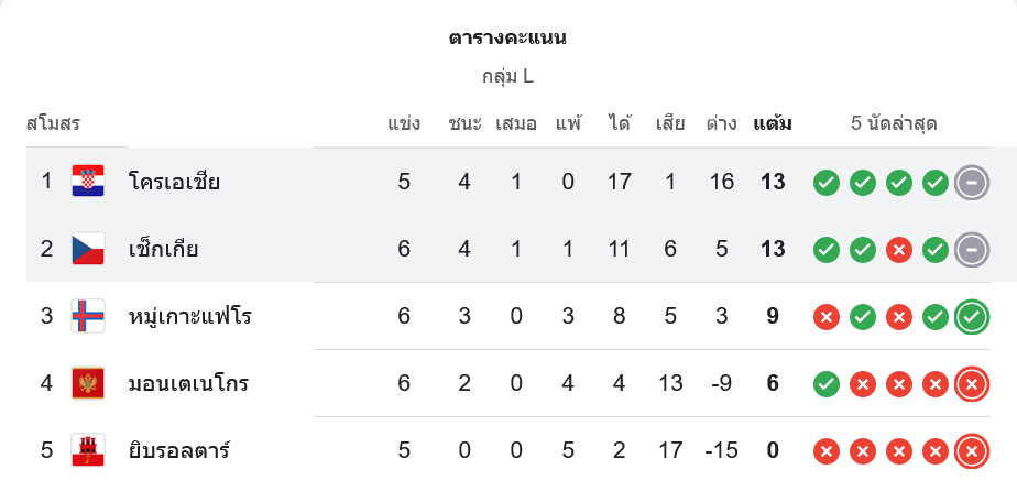 แม้จะเสมอแบบไร้สกอร์ แต่ทั้งสองทีมยังคงยึดหัวตารางกลุ่ม L ได้อย่างแข็งแกร่ง โดย โครเอเชีย มี 13 คะแนนจาก 5 นัดเท่ากับ สาธารณรัฐเช็ก ที่มี 13 คะแนนจาก 6 นัด โดยโครแอตนำอยู่ด้วยลูกได้เสียที่ดีกว่า ส่วนหมู่เกาะแฟโรตามมาเป็นอันดับ 3 ห่าง 4 คะแนน โอกาสลุ้นเข้ารอบยังเปิดกว้าง