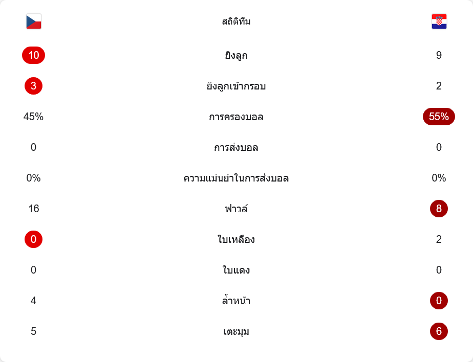 ตลอดทั้งเกม สาธารณรัฐเช็กมีโอกาสยิงถึง 10 ครั้ง เข้ากรอบ 3 ครั้ง ครองบอล 45% ส่วนโครเอเชียยิง 9 ครั้ง เข้ากรอบ 2 ครั้ง ครองบอล 55% เกมนี้มีจังหวะฟาวล์รวมกันมากถึง 24 ครั้ง ใบเหลืองเกิดขึ้นฝั่งโครเอเชีย 2 ใบ ส่วนเช็กไม่มีใบเหลืองเลย เตะมุม 5 ต่อ 6 แสดงให้เห็นถึงเกมที่เปิดแลก แต่จังหวะจบสกอร์ทั้งคู่ยังไม่เฉียบพอ