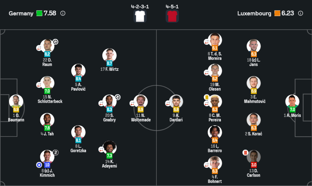 แผน 4-2-3-1 ของเยอรมนีเน้นคอนโทรลเกมจากคู่กลาง ปาฟโลวิช–โกเร็ตส์ก้า สลับต่ำสูงช่วยรีไซเคิลบอล เปิดทางให้ฟูลแบ็กอย่างคิมมิชและเราม์เติมกว้างจนกินพื้นที่ริมเส้นตลอด เกมรุกไหลผ่านเวิร์ตซ์ที่คอยเชื่อมสามเหลี่ยมกับกนาบรีและอเดเยมี การโจมตีจึงหลากหลายทั้งครอสลึกและชิ่งสั้นหน้าเขตโทษ ส่วนเกมรับ อินทรีเหล็กตั้งไลน์สูง ไล่เพรสทับทันทีที่เสียบอล ทำให้ลักเซมเบิร์กไม่อาจพาบอลข้ามเส้นกลางได้ถนัด
