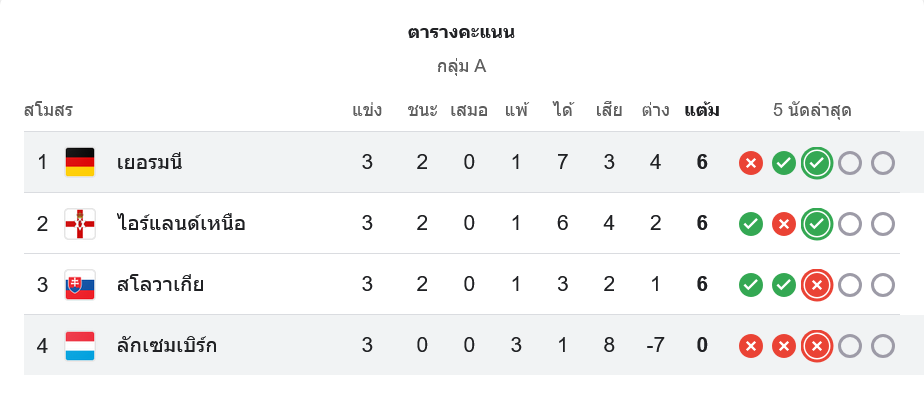 หลังจบเกมนี้ กลุ่ม A มีสามทีมแต้มเท่ากันที่ 6 คะแนน แต่เยอรมนีขึ้นนำด้วยผลต่างประตูได้เสียที่ดีกว่า (ได้ 7 เสีย 3) ตามด้วยไอร์แลนด์เหนือและสโลวาเกีย ส่วนลักเซมเบิร์กยังไร้แต้ม หล่นบ๊วยประตูได้เสีย -7 ภาพรวมเส้นทางยังเปิดกว้าง ทว่าฟอร์มวันนี้ย้ำชัดว่าอินทรีเหล็กถือไพ่เหนือในสายนี้