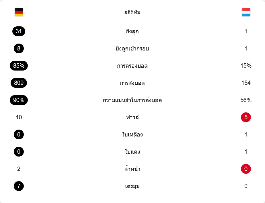 ภาพเกมสะท้อนด้วยตัวเลขชัดเจน เยอรมนีกระหน่ำยิงถึง 31 ครั้ง เข้ากรอบ 8 ครองบอล 85% ต่อ 15% จ่ายบอลมากถึง 809 ครั้ง ความแม่นยำ 90% ขณะที่ลักเซมเบิร์กจ่ายเพียง 154 ครั้ง แม่นยำ 56% โอกาสยิงมีแค่ 1 หน เข้ากรอบ 1 หน ลูกเตะมุม 7–0 ล้ำหน้า 2–0 ฟาวล์ใกล้เคียงกัน แต่ทีมเยือนรับใบเหลือง 1 และใบแดง 1 ต่างจากเจ้าถิ่นที่เล่นสะอาดไร้ใบ