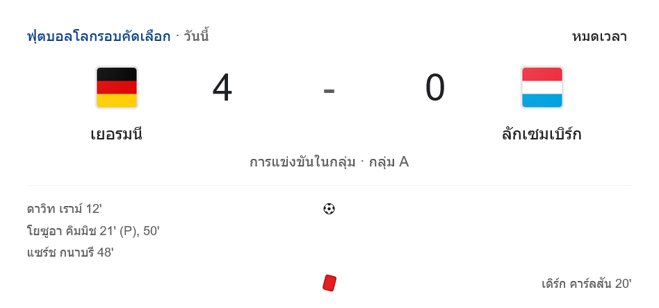 ลักเซมเบิร์กจัด 4-5-1 ตั้งบล็อกต่ำหวังรอสวน แต่ใบแดงนาที 20 ทำให้เสียสมดุลทั้งกว้างและลึก เหลือเพียงมอริสที่ต้องเซฟต่อเนื่อง ดาร์ดารีโดดเดี่ยวในแดนหน้า ขณะที่แดนกลางโดนตัดสายส่งตลอด ภาพรวมเชิง วิเคราะห์บอล คือความแตกต่างเชิงโครงสร้างและคุณภาพตัวบุคคลชัดเจน เยอรมนีเหนือชั้นทั้งรุกและรับ