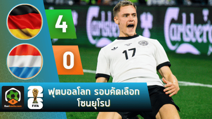 บ้านกีฬา สรุปเกมใหญ่ศึกคัดบอลโลกยุโรปแบบอัปเดตสไตล์ ผลบอลสด อินทรีเหล็ก เยอรมนี เปิดเครื่องถล่ม ลักเซมเบิร์ก 4-0 เกมที่บอกทุกอย่างชัด—คุณภาพ แนวทาง และความเฉียบคมของเจ้าถิ่นเหนือกว่าทุกมิติ ตั้งแต่นาทีต้นจนสิ้นเสียงนกหวีด