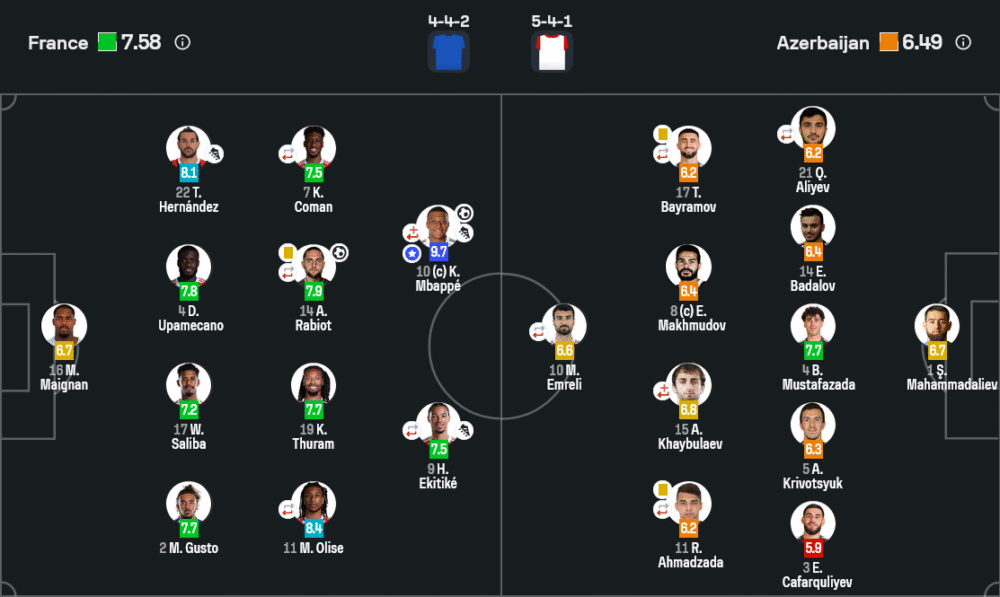 ด้านอาเซอร์ไบจานวางแท็คติก 5-4-1 เน้นตั้งรับลึกและบีบพื้นที่หน้ากรอบเขตโทษ แต่มักเปิดช่องให้ฝรั่งเศสเจาะจากจังหวะสวนเร็วและครอสด้านข้าง ขาดความดุดันในการสวนกลับ จึงไม่สามารถสร้างแรงกดดันได้เลยตลอดทั้งเกม ซึ่งในเชิง วิเคราะห์บอล นี่คือเกมที่แสดงให้เห็นชัดว่า “ความแตกต่างของคุณภาพนักเตะ” สามารถพลิกเกมตั้งแต่ครึ่งแรกได้