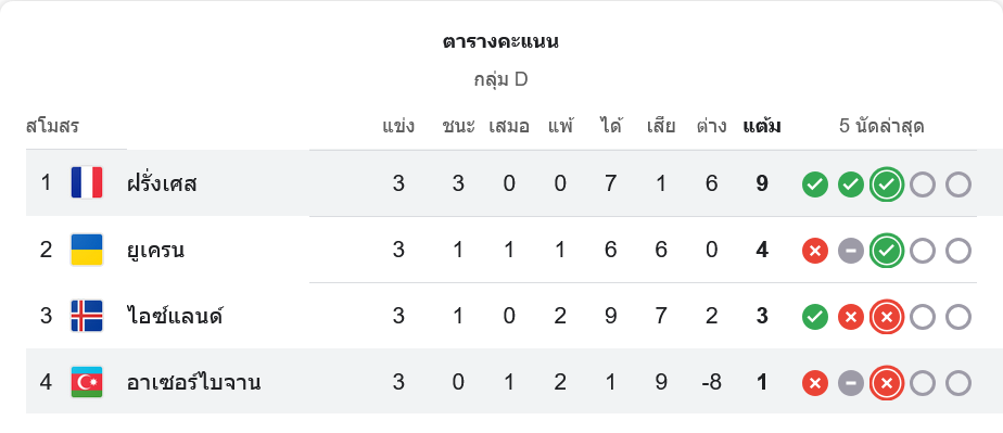หลังจบเกมนี้ ฝรั่งเศสเก็บ 9 คะแนนเต็มจาก 3 นัด นำจ่าฝูงกลุ่ม D แบบไร้คู่แข่งเบียด ยูเครนมี 4 คะแนนอยู่อันดับ 2 ตามด้วยไอซ์แลนด์ 3 แต้ม และอาเซอร์ไบจาน 1 แต้ม บ๊วยของกลุ่ม ซึ่งชัยชนะเกมนี้ส่งสัญญาณแรงว่า “ตราไก่” จ่อเข้ารอบแบบไม่ยาก
