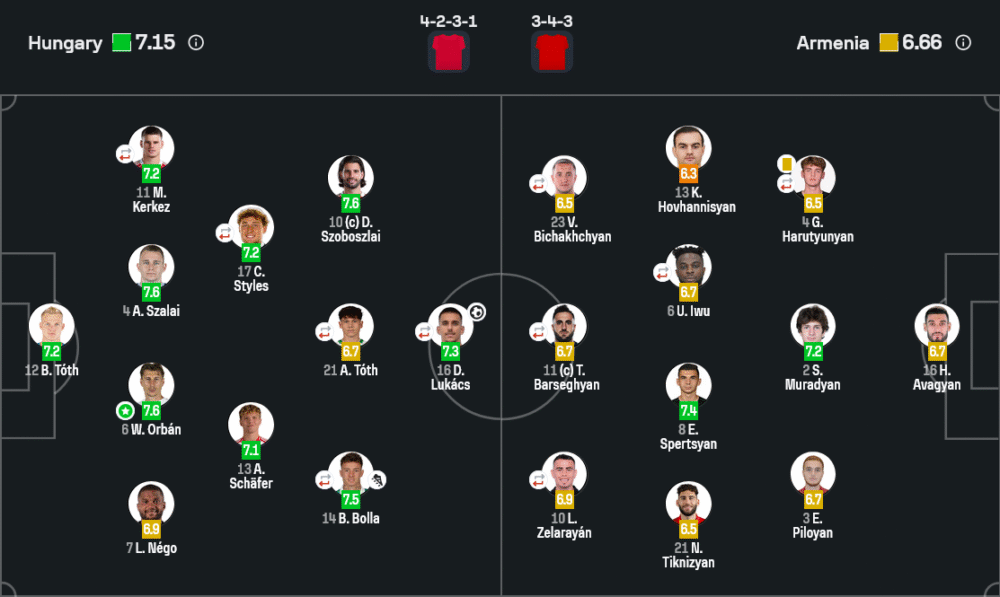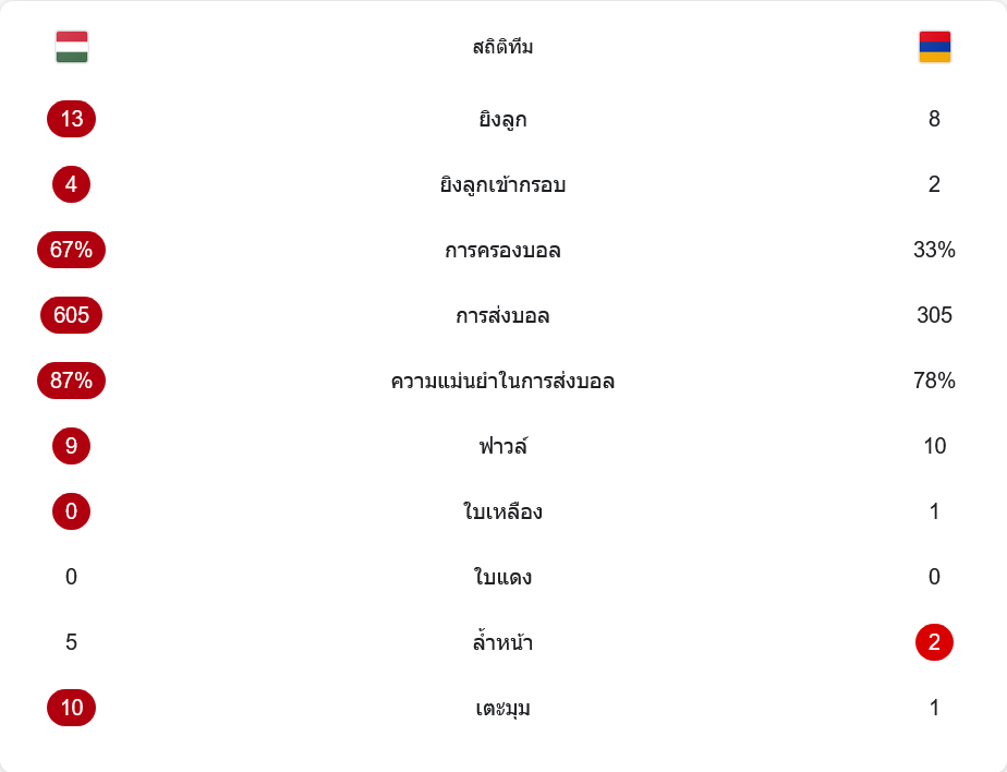 ตลอดทั้งเกม ฮังการีเหนือกว่าในแทบทุกด้าน พวกเขาครองบอลถึง 67% มีโอกาสยิง 13 ครั้ง เข้ากรอบ 4 ครั้ง การจ่ายบอลมากถึง 605 ครั้ง ความแม่นยำสูงถึง 87% ส่วนอาร์เมเนียได้ครองบอลเพียง 33% ยิง 8 ครั้ง เข้ากรอบ 2 ครั้ง การจ่ายบอล 305 ครั้ง ความแม่นยำ 78% ตัวเลขชัดเจนว่าทีมเจ้าบ้านคุมเกมได้เบ็ดเสร็จ แม้ทีมเยือนพยายามสู้แต่ขาดความเฉียบคม