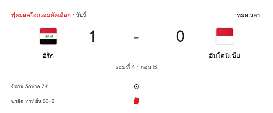 จาก : ผลบอลสด ฟุตบอลโลก รอบคัดเลือก โซนเอเชีย ระหว่าง อิรัก 1-0 อินโดนีเซีย วันนี้ 12/10/68 – บ้านกีฬา