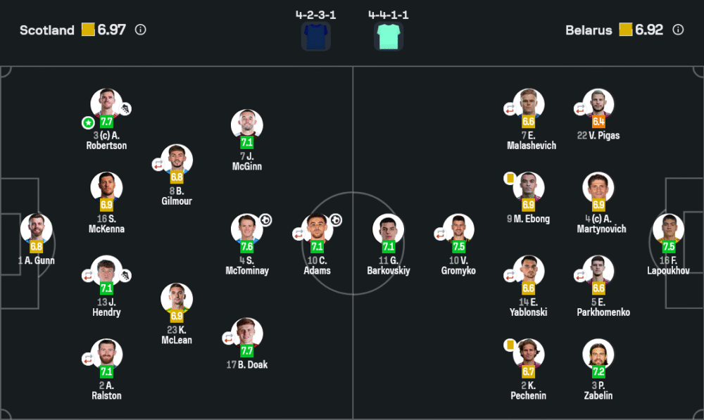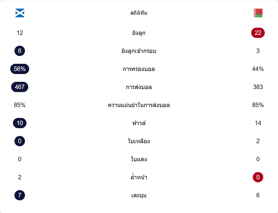 ในทางกลับกัน เบลารุสใช้แผน 4-4-1-1 เน้นรับและสวนกลับ ยิงมากถึง 22 ครั้งแต่เข้ากรอบเพียง 3 ครั้ง ความแม่นยำจังหวะสุดท้ายคือจุดอ่อนหลัก แม้พวกเขาจะมีจังหวะกดดันบ่อย แต่แนวรับสกอตแลนด์ยืนกันเป็นแพ็กแน่น เล่นกันอย่างมีวินัย จนเบลารุสต้องพึ่งประตูในช่วงทดเวลาเกือบหมดเวลา วิเคราะห์บอล เกมนี้ชี้ชัดว่า ความแตกต่างคือประสิทธิภาพ ไม่ใช่ปริมาณโอกาส