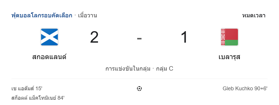 บ้านผลบอล สรุปหลังเกม ฟุตบอลโลก รอบคัดเลือก ดุเดือดสุดปลายเกม! สกอตแลนด์ เฉือน เบลารุส 2-1 ลุ้นเข้ารอบต่อเนื่อง