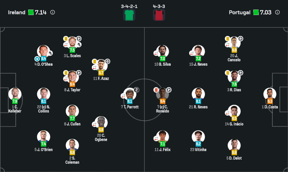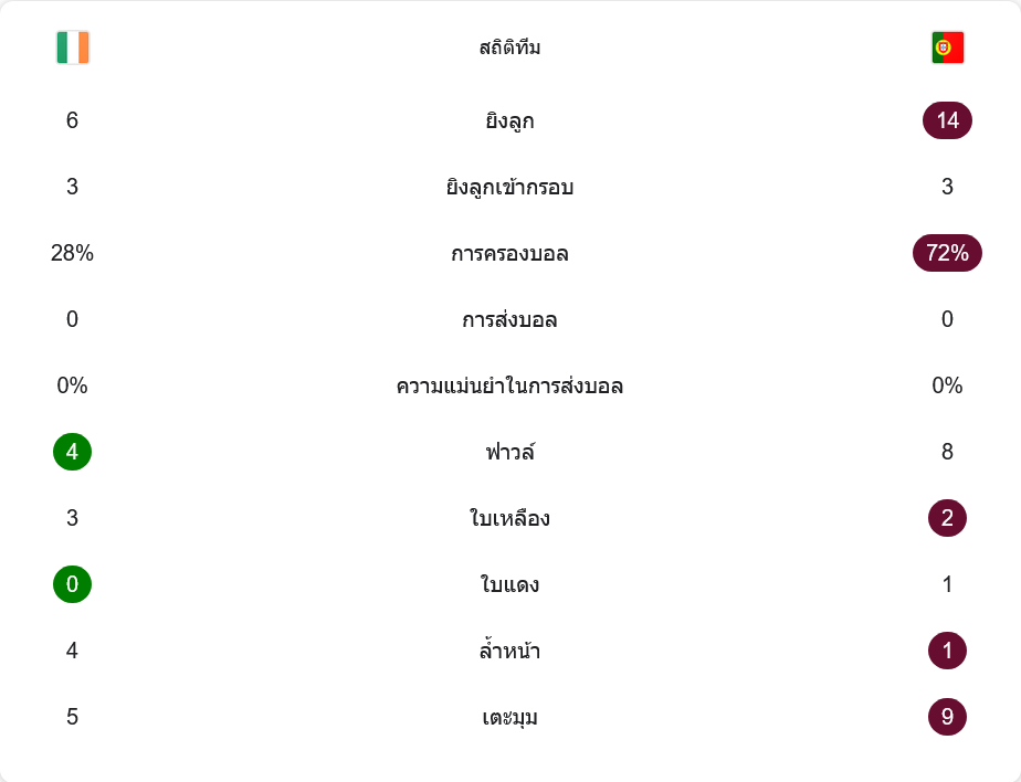 เมื่อมองตัวเลขหลังจบเกม โปรตุเกสครองบอลถึง 72% ต่อ 28% ของไอร์แลนด์ และยิงทั้งหมด 14 ครั้ง เทียบกับ 6 ครั้งของเจ้าบ้าน แต่ที่น่าสนใจคือจำนวนยิงเข้ากรอบกลับเท่ากันที่ 3 ครั้งต่อฝ่าย แสดงให้เห็นว่ารูปเกมของไอร์แลนด์แม้จะตั้งรับ แต่ทุกครั้งที่ได้โอกาสก็สร้างความอันตรายได้จริง