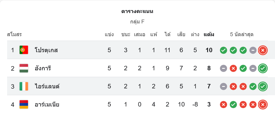 ฮังการี รั้งอันดับสองมี 8 คะแนน จากผลงาน 2 ชนะ 2 เสมอ 1 แพ้ 1 ประตูได้เสีย +2 ขณะที่ไอร์แลนด์ขยับมี 7 คะแนน จาก 2 ชนะ 1 เสมอ 2 แพ้ 1 ประตูได้ 6 เสีย 5 ประตูได้เสีย +1 ไล่จี้โซนหัวตารางแบบหายใจรดต้นคอ ส่วนอาร์เมเนียอยู่ท้ายกลุ่ม มี 3 คะแนน จาก 1 ชนะ 0 เสมอ 4 แพ้ 4 ประตูได้เสีย -8